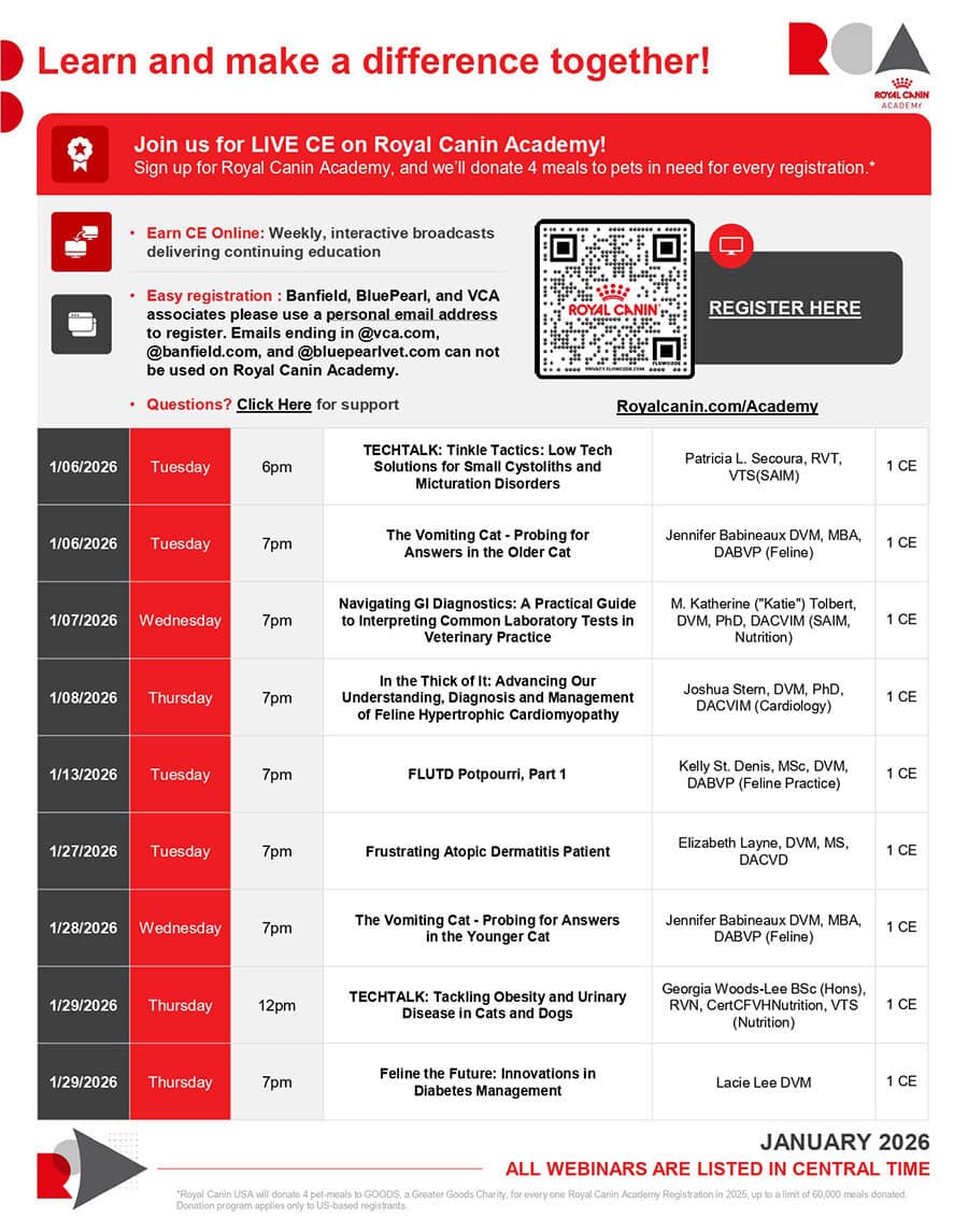 January 2026 brings several new and free online CE opportunities with Royal Canin Live